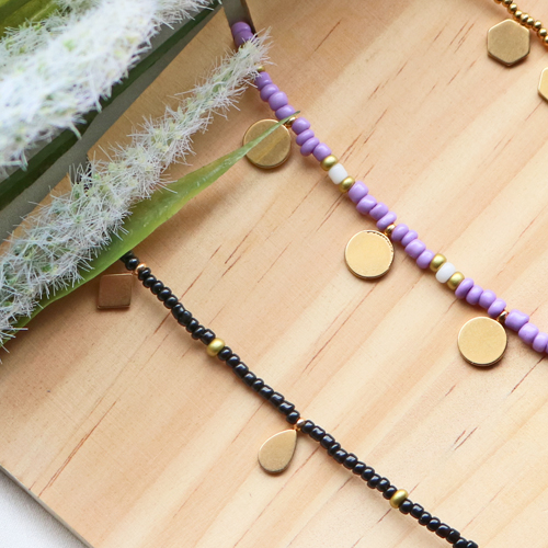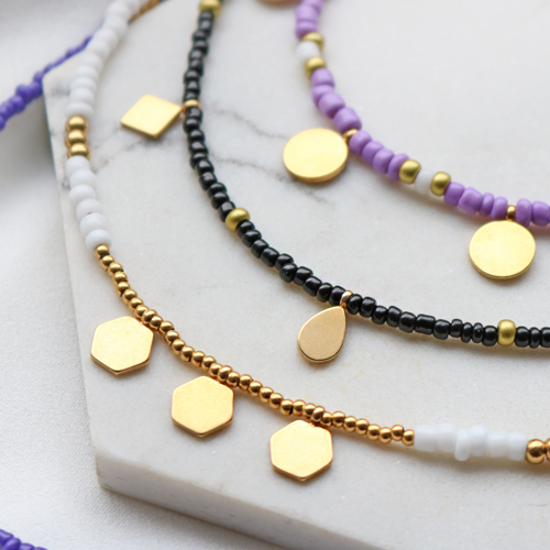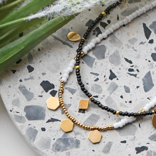 Avec les dernières breloques en acier inox, vous pouvez bien sûr fabriquer toutes sortes de bijoux super fun. Mais cette fois, nous avons choisi de les combiner dans un collier composé de rocailles. Pour réaliser ces colliers, enfilez par exemple des rocailles aux couleurs estivales sur du fil métallique. Vous pouvez ensuite enfiler, entre les rocailles, différentes breloques en acier inox. De cette façon, vous obtenez un collier original avec des détails minimalistes. Ces colliers se combinent également parfaitement les uns aux autres et vous pouvez choisir d’en porter plusieurs à la fois. En ajoutant une chaînette d’extension au fermoir, vous pourrez toujours faire varier la longueur de votre collier.
