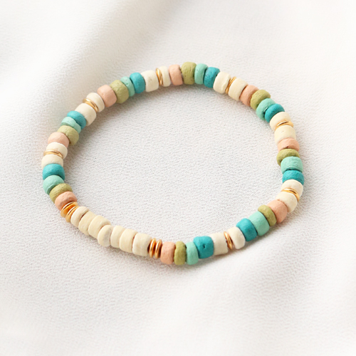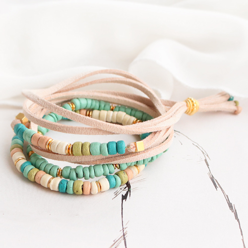 Avec les perles en coco, vous allez confectionner des bijoux au look naturel et au feeling bohème. Enfilez des perles en coco de différentes couleurs sur l’élastique et alternez-les avec des perles en métal DQ pour donner un effet original aux bracelets. Vous pouvez également enfiler les perles sur un clou à tête ronde et utiliser le connecteur fait maison pour en faire un bracelet avec un cordon en daim simili. Les boucles d’oreilles avec des perles en coco sont également très fun à confectionner. Accrochez votre breloque à l’apprêt de boucle d’oreille, en forme de demi-cercle par exemple. Vous pouvez ensuite y enrouler les perles en coco avec de l’Artistic Wire. Une autre astuce consiste à enfiler les perles sur une créole. Accrochez votre breloque préférée au milieu et collez un cabochon sur le clous de la boucle d’oreille. Amusez-vous bien !