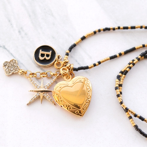 A la recherche de l’inspiration pour les fêtes ? Vous êtes au bon endroit chez Grossiste en Perles ! Découvrez notre nouvelle collection de strass, de perles alphabet et de médaillons ; parfaits pour fabriquer de magnifiques colliers. Comme vous pouvez voir sur l‘image, nous avons utilisé de la chaîne à billes dorée en combinaison avec de la chaîne maille jaseron et des breloques. Vous pouvez également utiliser du fil élastique noir en combinaison avec des perles Miyuki dorées, du strass, des perles alphabet et des médaillons.