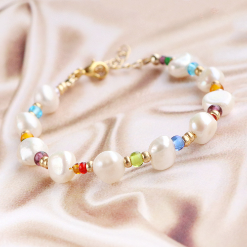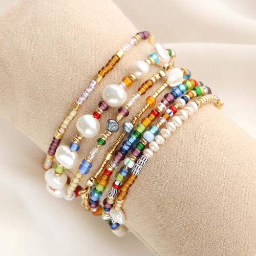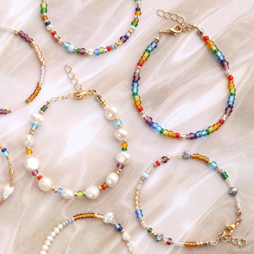 Ces bracelets tendance sont sympas à réaliser et à porter ! En utilisant du fil métallique, vos bracelets auront directement une belle forme ronde. Alternez différentes couleurs de rocailles Preciosa et insérez des perles plus grosses telles que des perles d’eau douce ou des perles coquillage pour un look élégant. Finissez les bracelets avec des perles à écraser et des chaînes d’extension et embellissez les bracelets avec une jolie breloque.
