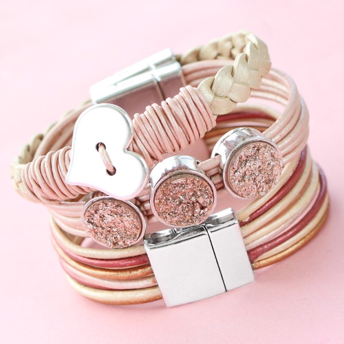 En combinant les cabochons Polaris Elements et les cordons en cuir DQ, vous pouvez créer un look très chic ! Les bracelets de cet ensemble se composent d'or doux, d'or blanc et de tons rosés. Ces bracelets sont intemporels et peuvent être portés toute l’année ! Grâce à l’excellente qualité, le cuir reste très magnifique. Pour ce bracelet, nous avons utilisé différents brins de cuir DQ rond ce qui donne un effet très sympa. Sur la bande des brins, nous avons glissé un serti pour cabochon et nous avons collé les extrémités des brins dans un fermoir en métal BQ. Ensuite, nous avons collé un cabochon assorti sur le serti et le tour est joué ! Astuce : si vous voulez fabriquer vous-même ces bracelets, veillez à couper tous les brins de la même longueur, afin que le bracelet soit parfait !