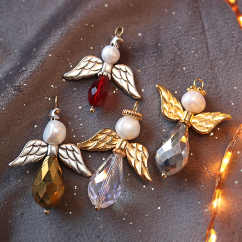 Le matériel nécessaire à la confection des anges est le suivant : des clous à tête plate, des perles Polaris Elements ou des perles goutte à facettes, des perles ailes d’anges en métal DQ, des perles d’eau douce ou des perles à facettes, des perles strass rondelle ou des perles spacer en métal DQ, une pince coupante et une pince à bout rond. Vous commencez par enfiler une perle sur le clou à tête plate, puis vous enfiliez les éléments mentionnés ci-dessus sur le clou à tête plate dans l’ordre de votre choix. Pour la tête, vous pouvez bien entendu utiliser d’autres perles que les perles d’eau douce et les perles à facettes. Lorsque vous avez terminé d’enfiler, coupez le clou à tête plate à environ 1 cm au-dessus de la dernière perle. Pliez-y ensuite un œillet à l’aide de la pince à bout rond. C’est aussi simple que cela, bonne chance !