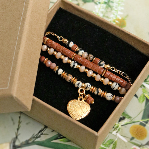 Laissez-vous inspirer pour démarrer avec les toutes nouvelles perles en pierre naturelle jade ! Cette fois, nous avons choisi de travailler avec des perles en pierre naturelle et de l’Artistic Wire. Confectionnez par exemple un superbe bracelet ou des boucles d’oreilles en enroulant le fil autour des perles en pierre naturelle. Vous commencez le bracelet avec un long morceau d’Artistic Wire que vous courbez deux fois. Faites ensuite un œillet avec la courbe que vous avez ainsi obtenue. Ensuite, vous enfilez les perles sur le fil et vous enroulez l’autre extrémité autour du fil et des perles. Lorsque vous avez terminé, vous pouvez également plier un crochet avec le fil afin de disposer immédiatement d’un fermoir assorti. La technique consistant à envelopper le fil peut également être très séduisante dans une paire de boucles d’oreilles. Complétez l’ensemble en combinant un mix de perles en pierre naturelle, de perles en métal DQ, de perles à facettes sur du fil élastique par exemple. Amusez-vous bien !