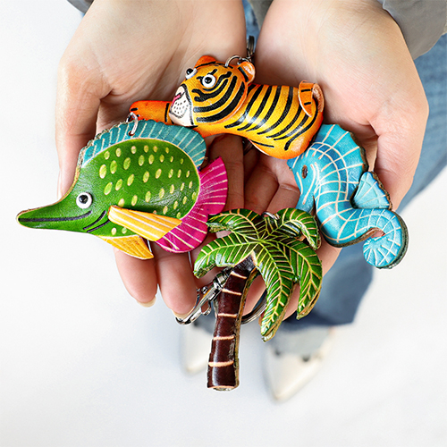 Envie d'un accessoire en cuir qui se démarque immédiatement ? Cette nouvelle collection se compose de porte-monnaie et de porte-clés en cuir faits main, aux formes inspirées de la vie marine, avec notamment un hippocampe, une tortue, un palmier et bien d'autres variantes. Découvrez ici la collection complète.