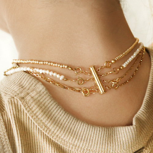 Avec ces apprêts en acier inox de très belle qualité, vous allez pouvoir confectionner de superbes bijoux. Concevez, par exemple, un collier à plusieurs rangs avec le fermoir auquel vous pouvez attacher trois colliers. Préparez un collier plus long en jaseron et accrochez-y une perle tube où vous confectionnerez une breloque avec un clou à tête plate et une bille. Réalisez deux colliers plus courts avec des perles d’eau douce et des perles de rocailles dont vous ferez des fleurs. Les porte-clés sont particulièrement adaptés à un projet de macramé avec du fil macramé ou du cordon en coton ciré.