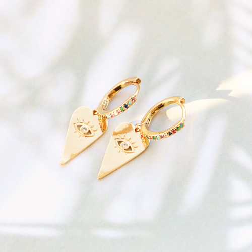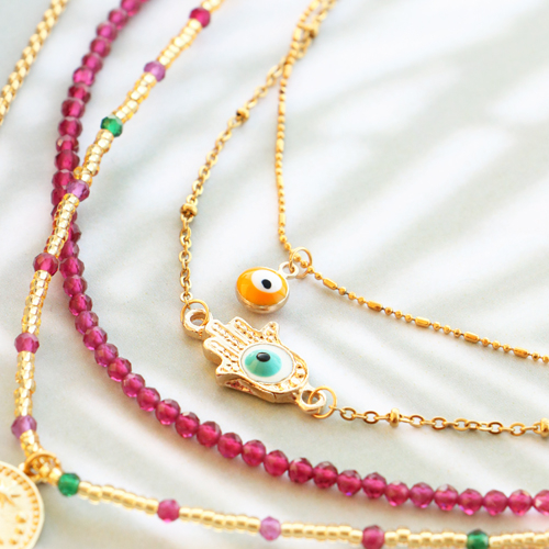 Besoin d’inspiration pour réaliser des bijoux tendance avec l’œil porte-bonheur ? Alors vous êtes à la bonne adresse ! Nous avons déjà commencé à travailler avec la gamme et réalisé un certain nombre d’articles contemporains. Confectionnez par exemple un élégant collier en jaseron et accrochez-y votre breloque préférée avec l’œil porte-bonheur / l’œil omniscient. Vous pouvez bien entendu également confectionner des boucles d’oreilles minimalistes et branchées avec ces breloques. Choisissez d’abord un de nos supports boucle d’oreille ou une créole et attachez-y ensuite la breloque « œil porte-bonheur / œil omniscient ». Vous voulez donner plus de couleur à l’ensemble ? Alors, vous pouvez également enfiler des perles de rocailles, des perles à facettes et des perles en métal DQ sur le collier. Utilisez un pendentif avec un œil pour y attacher une breloque.