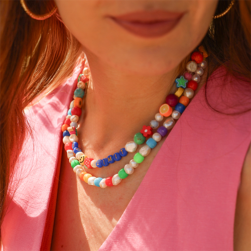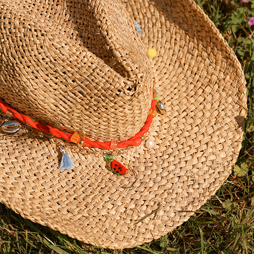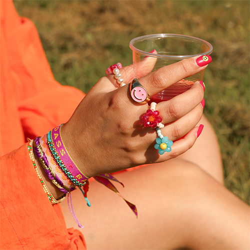 Laissez-vous inspirer et découvrez les incontournables du festival ! Colliers avec perles en acrylique (lettres), colliers prêts à porter, petits fruits en polymère et smileys en céramique sont totalement in. Pour les accessoires de chapeau, choisissez du ruban élastique, des perles acryliques, du jaseron, des pompons, des perles et des breloques en forme de fruits. Les bracelets avec les rubans à texte ou les bracelets tissés prêts à l'emploi sont très tendance.
