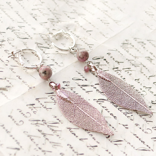 Porte-clés + boucles d’oreilles avec véritables feuilles, pierres naturelles et du fil macramé